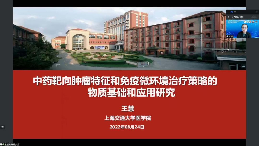 隨后報(bào)告由王昊教授委員主持。上海交通大學(xué)醫(yī)學(xué)院公共衛(wèi)生學(xué)院院長(zhǎng)王慧教授為大家?guī)?lái)《中藥靶向腫瘤特征和免疫微環(huán)境治療策略的物質(zhì)基礎(chǔ)和應(yīng)用研究》,分享了自己課題組在復(fù)方苦參注射液和青蒿素類化合物抗癌機(jī)制、腫瘤介導(dǎo)的先天免疫調(diào)控機(jī)制、微生物組與腫瘤發(fā)生發(fā)展機(jī)制的研究成果。